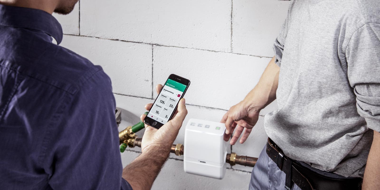 Ein Mann mit einer Steuerungsapp auf dem Handy, steht vor einem Digitalregler
